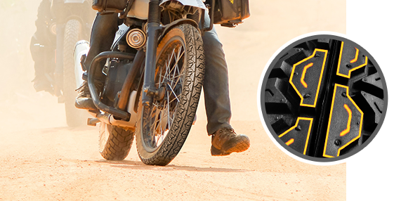 Monsoon riding can be memorable or nightmarish - it all depends on the tyre you choose for your bike. With a wet grip like no other, the deep treads and long grooves on our tyres minimize hydroplaning. Tyre expels water and slush faster on-the-go so that your rides are skid-safe even on wet surfaces.