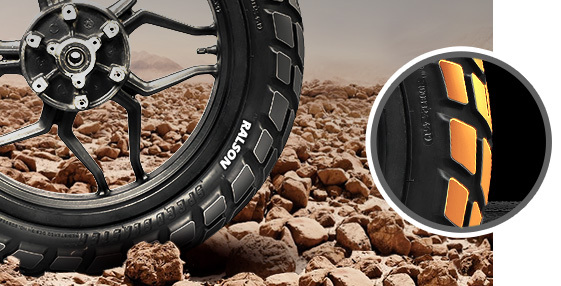 Hey adrenaline junkie... go challenge the dirt! RALSON is designed for sharp steering confidence and excellent braking control even while off-roading. Every tyre is carefully inspected as well as certified against undesirable wobbling. We use the latest avant-garde tools for tyre casing, along with a special tread compound for added traction. This imparts superior balance and high stability to your adventurous rides.